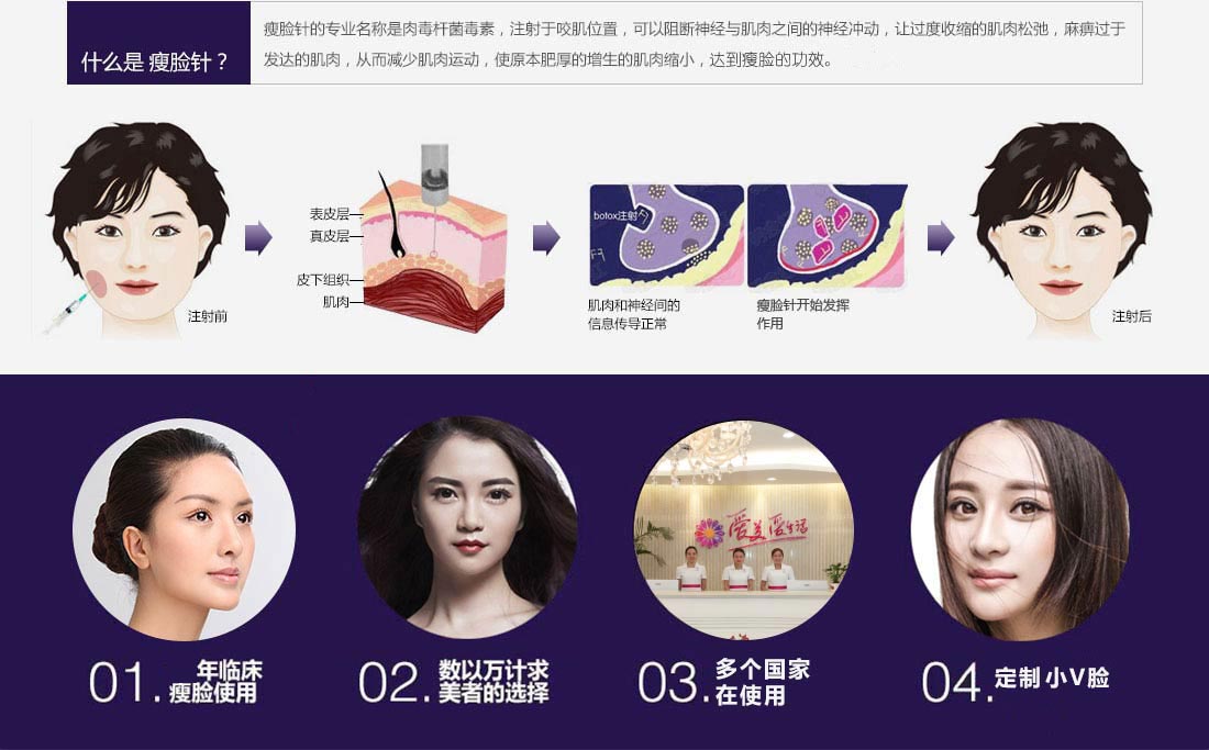 瘦脸针是采用肉毒素针剂来治疗咬肌肥大,通过肉毒素的作用使咬肌萎缩,变小从而达到瘦脸的目的。目前,注射肉毒素瘦脸所使用的剂量,十分安全。瘦脸针不开刀、苦,注射需10分钟,因此受到了很多爱美者的青睐。